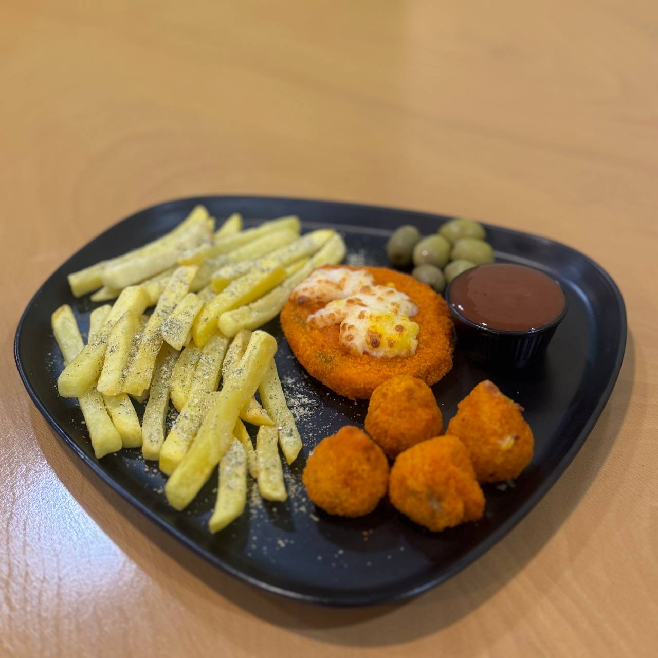 یک عدد شنیسل پیتزایی + چهارعدد توپک پنیری + سیب زمینی سرخ شده